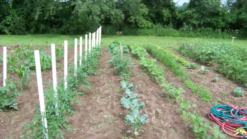 We drilled holes in pvc pipe to tie the tomatoes to. It's working